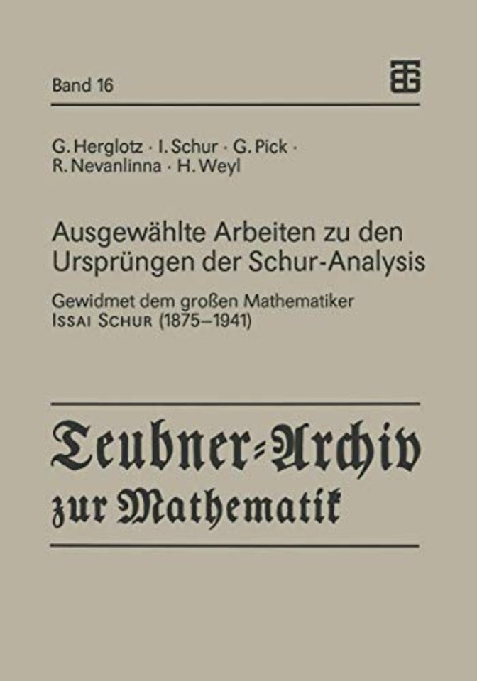 Dieser Band des "TEUBNER-ARCHIVs zur Mathematik" enthält klassische ma thematische Arbeiten, welche im Zeitraum von 1911 bis 1935 von GusTAV HER GLOTZ, ISSAI SCHUR, GEORG PICK, ROLF NEVANLINNA und HERMANN WEYL verfaßt wurden und aus heutiger Sicht die Ursprünge einer mathematischen Richtung mar kieren, welche sich in den 80er Jahren an der Nahtstelle verschiedener mathemati scher Disziplinen herausbildete und nun unter der Bezeichnung "Schur-Analysis" Eingang in die mathematische Literatur gefunden hat. Hervorstechendes Merkmal der Schur-Analysis ist ihr algorithmischer Charakter, der bereits in IssAI ScHURS grundlegender Arbeit "Über Potenzreihen, die im In nem des Einheitskreises beschränkt sind", welche 1917 und 1918 in zwei Teilen im "Journal für die reine und angewandte Mathematik" veröffentlicht wurde, prägnant zum Ausdruck kommt. Der dort kreierte tiefsinnige Algorithmus, welcher heute nun unter dem Terminus "Schur-Algorithmus" gefaßt wird, beinhaltet alle haupt sächlichen Wesenszüge der Methode und trug wesentlich dazu bei, daß für diese die Begriffsbildung "Schur-Analysis" gewählt wurde. Es ist deshalb nur folgerichtig, daß die oben genannte Arbeit IssAI ScHuRs eine zentrale Stellung einnimmt.