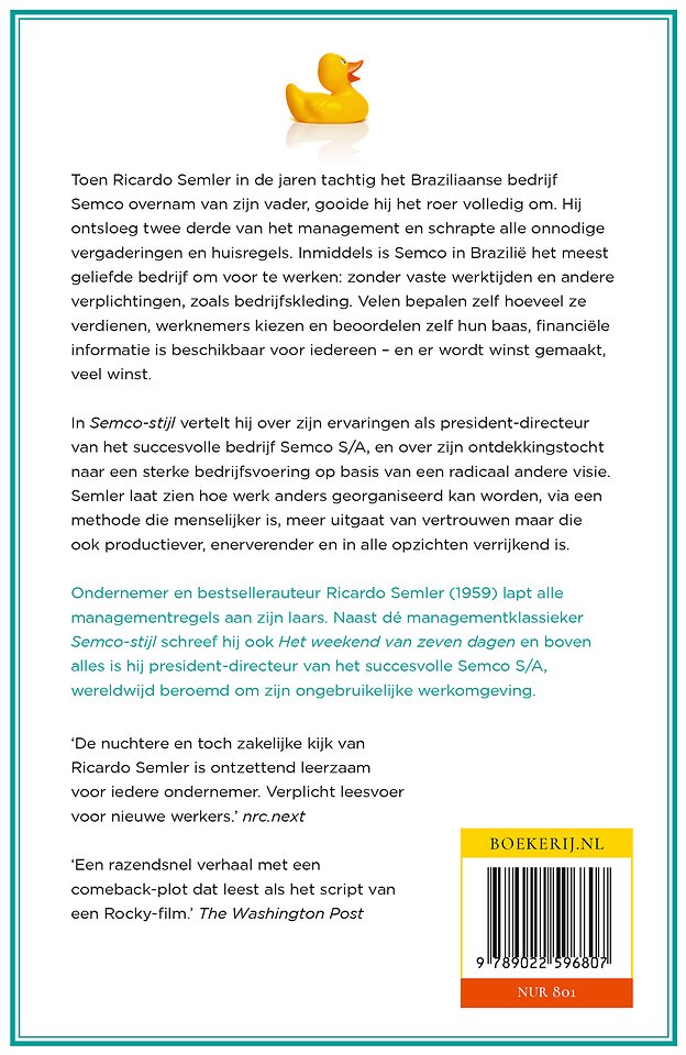 Meer over Ricardo SemlerSemco is in Brazilië het meest geliefde bedrijf om voor te werken: zonder vaste werktijden en andere verplichtingen, zoals bedrijfskleding. Velen bepalen zelf hoeveel ze verdienen, werknemers kiezen en beoordelen zelf hun baas, financiële informatie is beschikbaar voor iedereen - en er wordt winst gemaakt, veel winst.