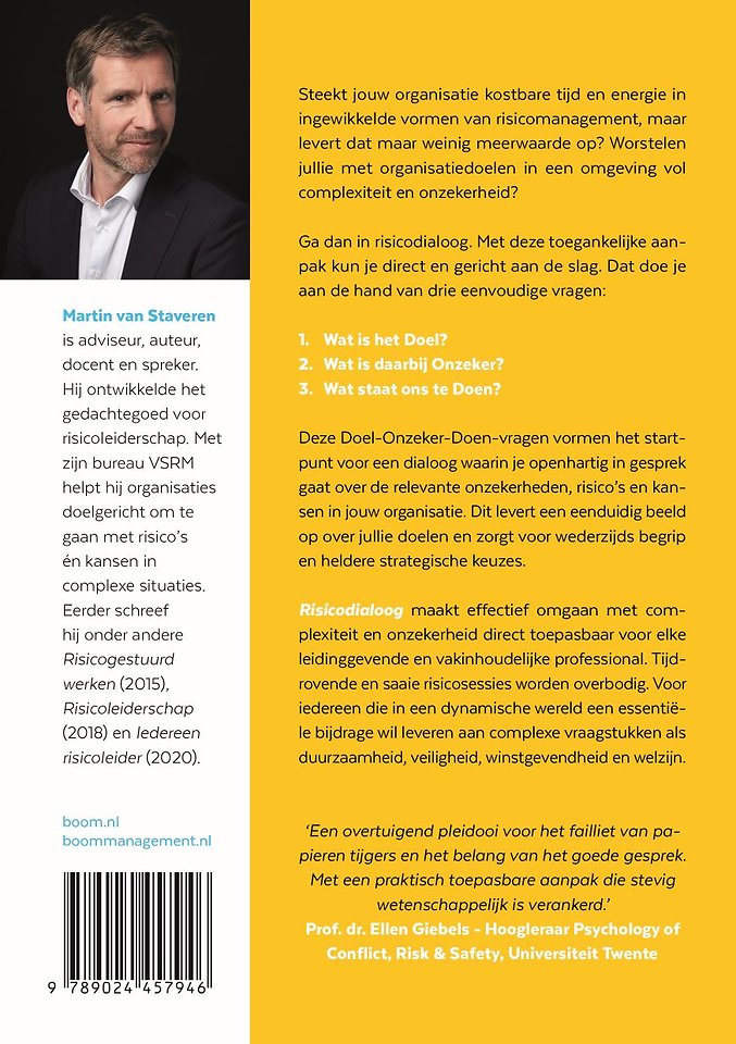 Risicodialoog maakt effectief omgaan met complexiteit en onzekerheid direct toepasbaar voor elke leidinggevende en vakinhoudelijke professional. Tijdrovende en saaie risicosessies worden overbodig. Voor iedereen die in een dynamische wereld een essentiële bijdrage wil leveren aan complexe vraagstukken als duurzaamheid, veiligheid, winstgevendheid en welzijn.
