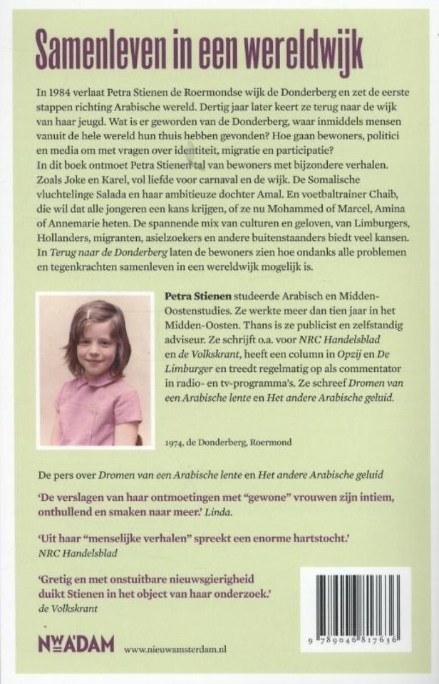 In 1984 verlaat Petra Stienen de Roermondse wijk de Donderberg en zet de eerste stappen richting Arabische wereld. Dertig jaar later keert ze terug naar deze wijk van haar jeugd. Wat is er geworden van de Donderberg, waar inmiddels mensen vanuit de hele wereld hun thuis hebben gevonden? Hoe gaan bewoners, politici en media om met vragen over identiteit, migratie en participatie? In dit boek ontmoet Petra Stienen tal van bewoners met bijzondere verhalen. Zoals Joke en Karel, vol liefde voor carnaval en de wijk. De Somalische vluchtelinge Salada en haar ambitieuze dochter Amal. En voetbaltrainer Chaib, die wil dat alle jongeren een kans krijgen, of ze nu Mohammed of Marcel, Amina of Annemarie heten. De spannende mix van culturen en geloven, van Limburgers, Hollanders, migranten, asielzoekers en andere buitenstaanders biedt veel kansen. In Terug naar de Donderberg laten de bewoners zien dat ondanks alle problemen en tegenkrachten samenleven in een wereldwijk mogelijk is.