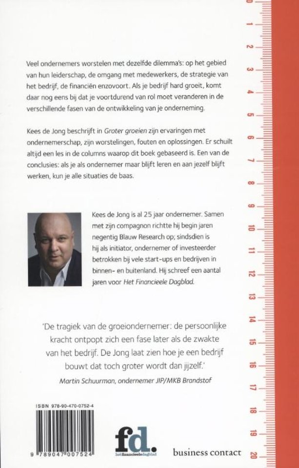 Kees de Jong beschrijft in 'Groter groeien' zijn ervaringen met ondernemerschap, zijn worstelingen, fouten en oplossingen. Er schuilt altijd een les in de columns waarop dit boek gebaseerd is. Een van de conclusies: als u als ondernemer maar blijft leren en aan uzelf blijft werken, kunt u alle situaties de baas.