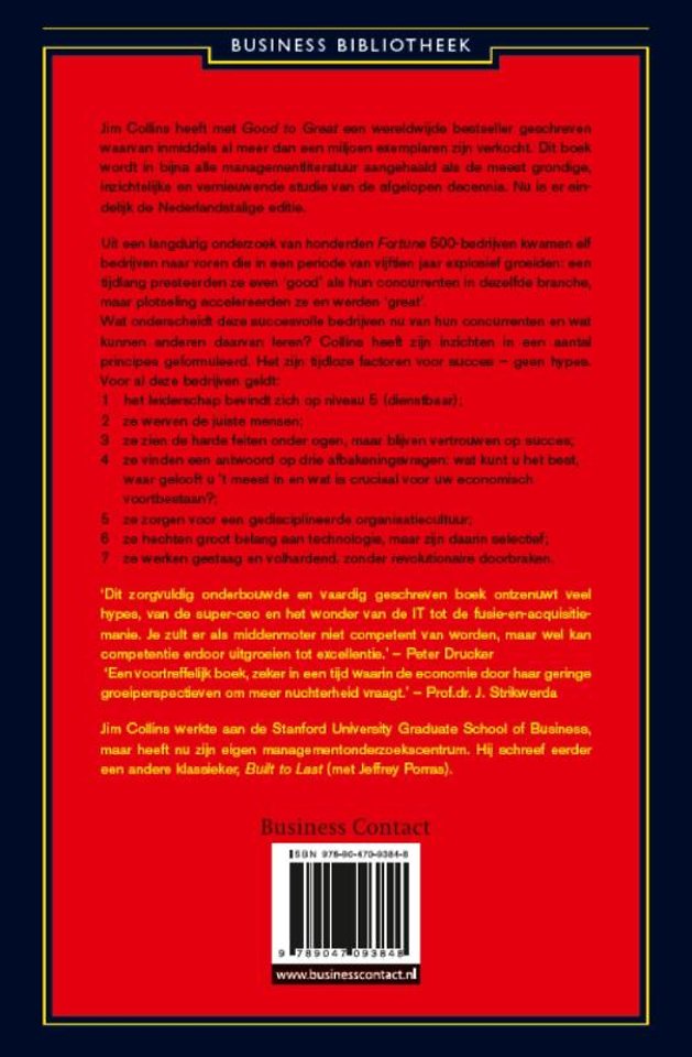 Meer over Jim CollinsJim Collins heeft met 'Good to Great' een wereldwijde bestseller geschreven waarvan inmiddels al meer dan een miljoen exemplaren zijn verkocht. Dit boek wordt in bijna alle managementliteratuur aangehaald als de meest grondige, inzichtelijke en vernieuwende studie van de afgelopen decennia. Inmiddels geldt ook de Nederlandstalige editie als een klassieker.