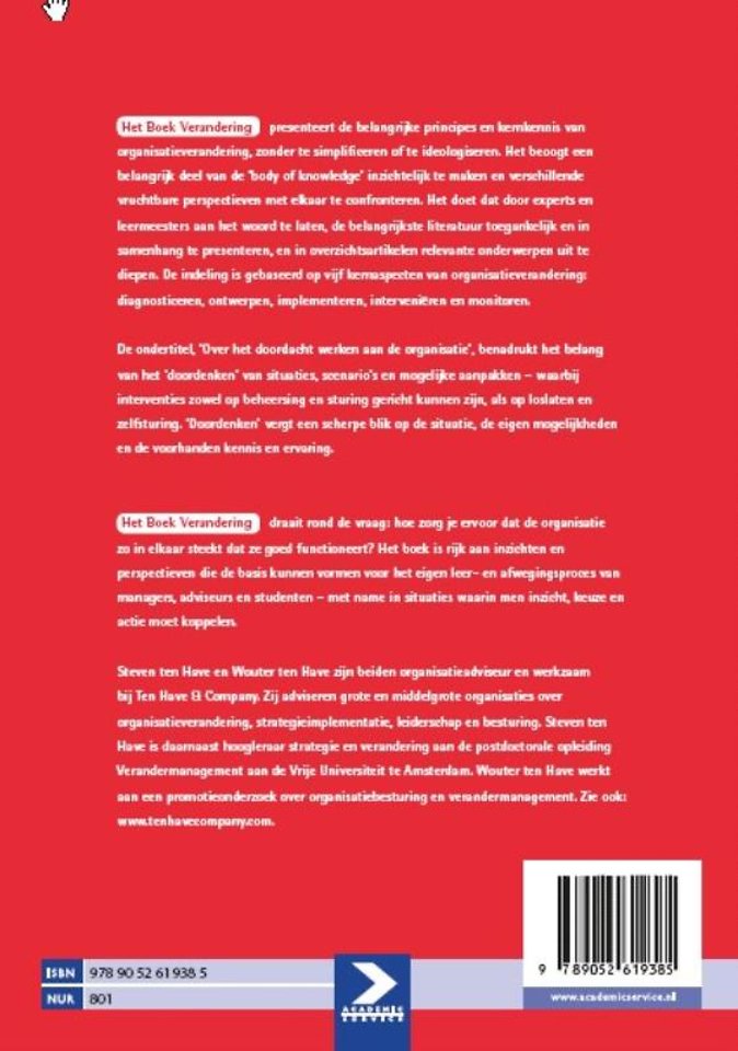 Meer over de auteurs'Het Boek Verandering' presenteert de belangrijke principes en kernkennis van organisatieverandering, zonder te simplificeren of te ideologiseren. Het beoogt een belangrijk deel van de 'body of knowledge' inzichtelijk te maken en verschillende vruchtbare perspectieven met elkaar te confronteren. Het doet dat door experts en leermeesters aan het woord te laten, de belangrijkste literatuur toegankelijk en in samenhang te presenteren, en in overzichtsartikelen relevante onderwerpen uit te diepen. De indeling is gebaseerd op vijf kernaspecten van organisatieverandering: diagnosticeren, ontwerpen, implementeren, interveniëren en monitoren.