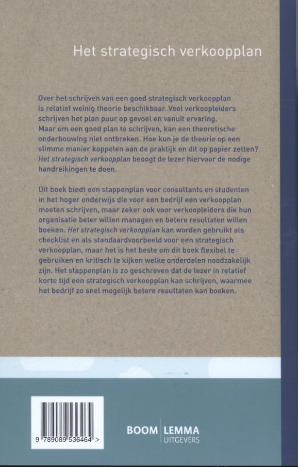 Dit boek biedt een stappenplan voor consultants en studenten in het hoger onderwijs die voor een bedrijf een verkoopplan moeten schrijven, maar zeker ook voor verkoopleiders die hun organisatie beter willen managen en betere resultaten willen boeken. 'Het strategisch verkoopplan' kan worden gebruikt als checklist, als standaardvoorbeeld voor een strategisch verkoopplan, maar het is het beste om dit boek flexibel te gebruiken en kritisch te kijken welke onderdelen noodzakelijk zijn. Het stappenplan is zo geschreven dat de lezer in relatief korte tijd een strategisch verkoopplan kan schrijven. Op die manier kan het bedrijf zo snel mogelijk betere resultaten boeken.