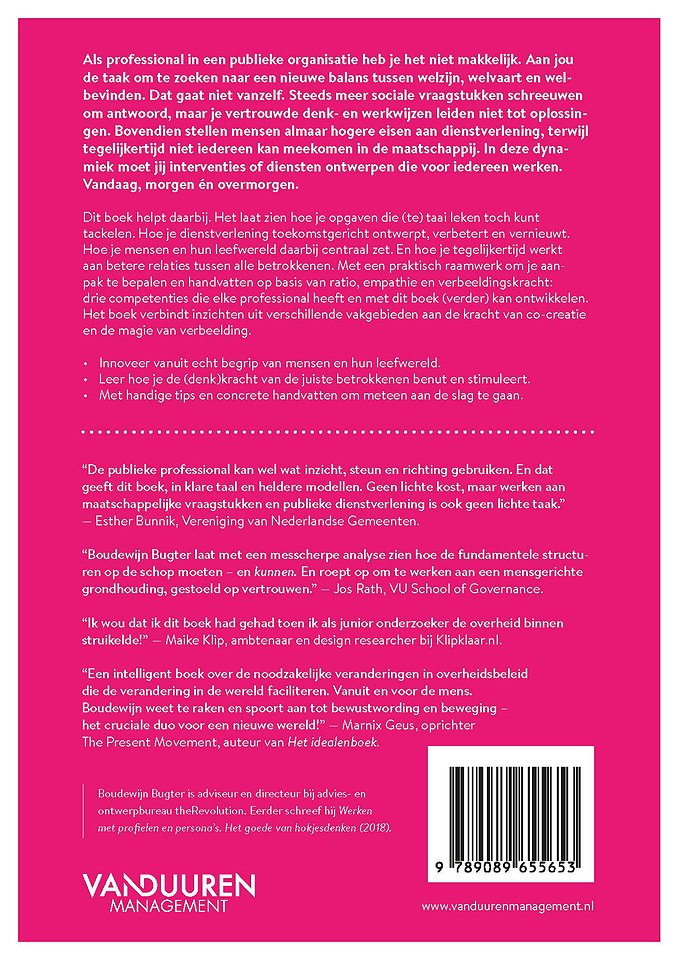 Meer over Boudewijn BugterAls professional in een publieke organisatie heb je het niet makkelijk. Aan jou de taak om te zoeken naar een nieuwe balans tussen welzijn, welvaart en welbevinden. Dat gaat niet vanzelf. Steeds meer sociale vraagstukken schreeuwen om antwoord, maar je vertrouwde denk- en werkwijzen leiden niet tot oplossingen. Bovendien stellen mensen almaar hogere eisen aan dienstverlening, terwijl tegelijkertijd niet iedereen kan meekomen in de maatschappij. In deze dynamiek moet jij interventies of diensten ontwerpen die voor iedereen werken. Vandaag, morgen én overmorgen.