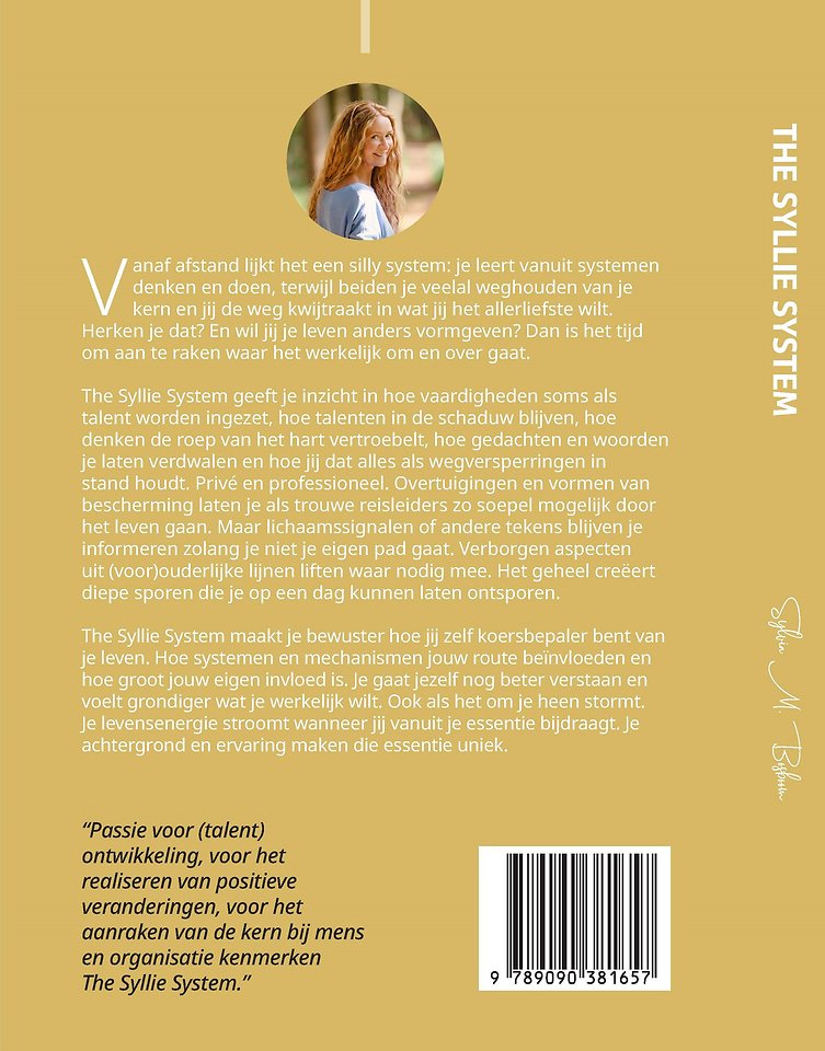 The Syllie System geeft je inzicht in hoe vaardigheden soms als talent worden ingezet, hoe talenten in de schaduw blijven, hoe denken de roep van het hart vertroebelt, hoe gedachten en woorden je laten verdwalen en hoe jij dat alles als wegversperringen in stand houdt. Privé en professioneel. Overtuigingen en vormen van bescherming laten je als trouwe reisleiders zo soepel mogelijk door het leven gaan. Maar lichaamssignalen of andere tekens blijven je informeren zolang je niet je eigen pad gaat.
