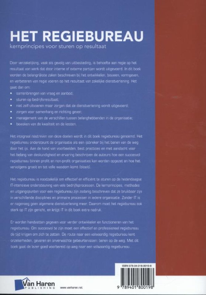 In dit boek worden de belangrijkste zaken beschreven die een rol spelen bij het concept van het regiebureau, dat wil zeggen bij het ontwikkelen, bouwen, vormgeven, verbeteren en het sturen op uitvoering. Het regiebureau is met name een nuttig concept als je effectief en efficiënt wilt sturen op de hedendaagse IT-intensieve ondersteuning van de bedrijfsprocessen.