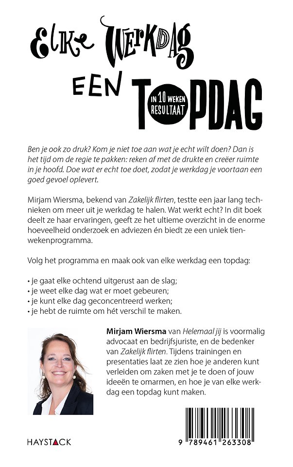 Mirjam Wiersma, bekend van Zakelijk flirten, testte een jaar lang technieken om meer uit je werkdag te halen. Wat werkt echt? In dit boek deelt ze haar ervaringen, geeft ze het ultieme overzicht in de enorme hoeveelheid onderzoek en adviezen én biedt ze een uniek tienwekenprogramma.