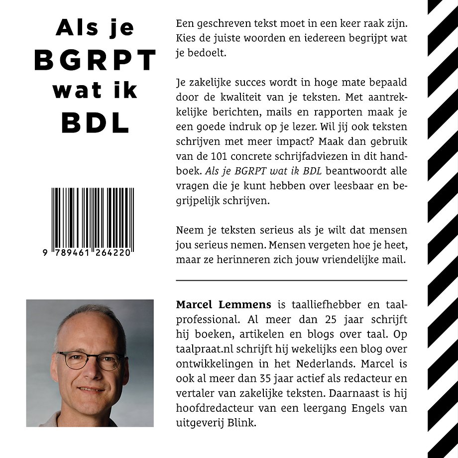 Je zakelijke succes wordt in hoge mate bepaald door de kwaliteit van je teksten. Met aantrekkelijke berichten, mails en rapporten maak je een goede indruk op je lezer. Wil jij ook teksten schrijven met meer impact? Maak dan gebruik van de 101 concrete schrijfadviezen in dit handboek. 'Als je BGRPT wat ik BDL' beantwoordt alle vragen die je kunt hebben over leesbaar en begrijpelijk schrijven.