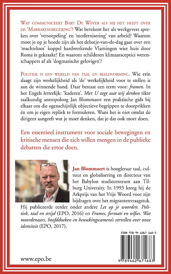 Politiek is een wereld van taal en beeldvorming. Wie erin slaagt zijn werkelijkheid als ‘de’ werkelijkheid voor te stellen is aan de winnende hand. Daar bestaat een term voor: framen. In het Nederlands letterlijk ‘kaderen’. Met U zegt wat wij denken tikte taalkundig antropoloog Jan Blommaert een praktische gids bij elkaar om die ogenschijnlijk objectieve begrippen te doorprikken én om je eigen repliek te formuleren. Want het is niet omdat de dirigent aangeeft wat je moet denken, dat je dat ook moet doen.