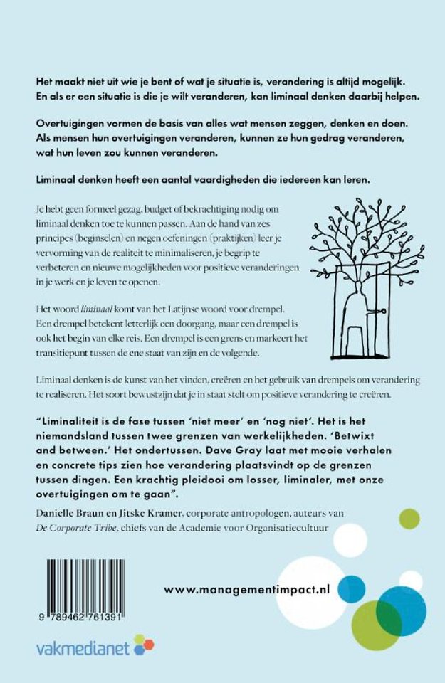 "Liminaliteit is de fase tussen ‘niet meer’ en ‘nog niet’. Het is het niemandsland tussen twee grenzen van werkelijkheden. ‘Betwixt and between.’ Het ondertussen. Dave Gray laat met mooie verhalen en concrete tips zien hoe verandering plaatsvindt op de grenzen tussen dingen. Een krachtig pleidooi om losser, liminaler, met onze overtuigingen om te gaan". - Danielle Braun en Jitske Kramer, corporate antropologen, auteurs van De Corporate Tribe, chiefs van de Academie voor Organisatiecultuur
