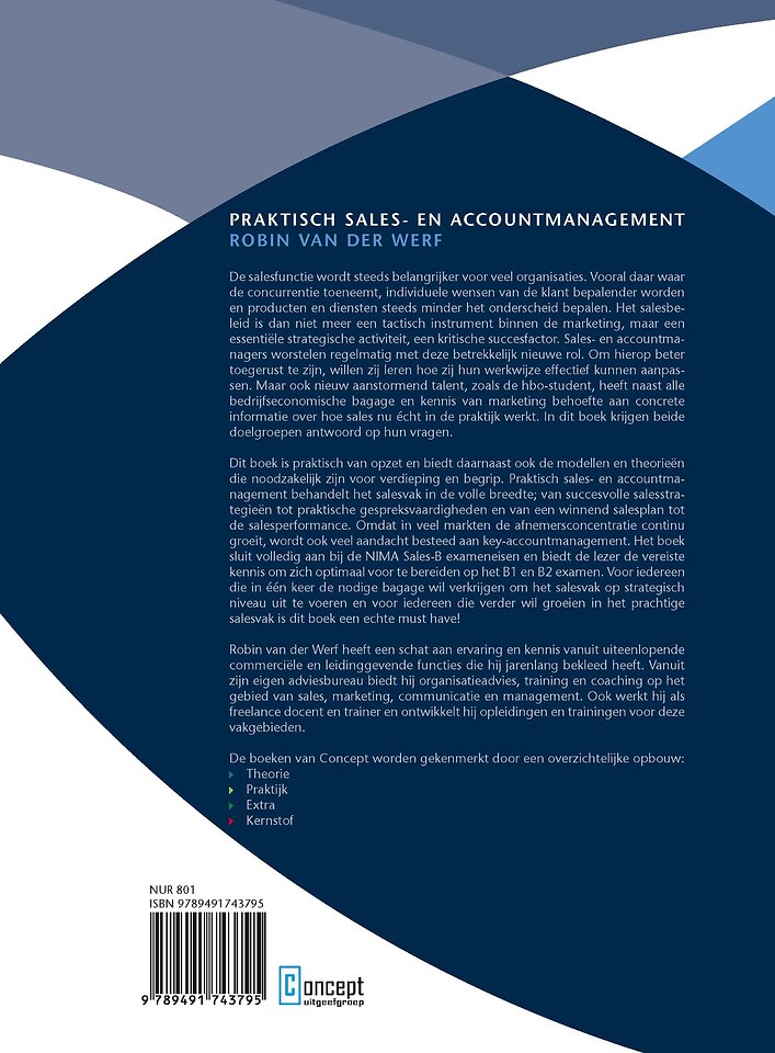 Dit boek is praktisch van opzet en biedt daarnaast ook de modellen en theorieën die noodzakelijk zijn voor verdieping en begrip. 'Praktisch sales- en accountmanagement' behandelt het salesvak in de volle breedte; van succesvolle salesstrategieën tot praktische gespreksvaardigheden en van een winnend salesplan tot de salesperformance. Omdat in veel markten de afnemersconcentratie continu groeit, wordt ook veel aandacht besteed aan key-accountmanagement. Het boek sluit volledig aan bij de NIMA Sales-B exameneisen en biedt de lezer de vereiste kennis om zich optimaal voor te bereiden op het B1 en B2 examen.
