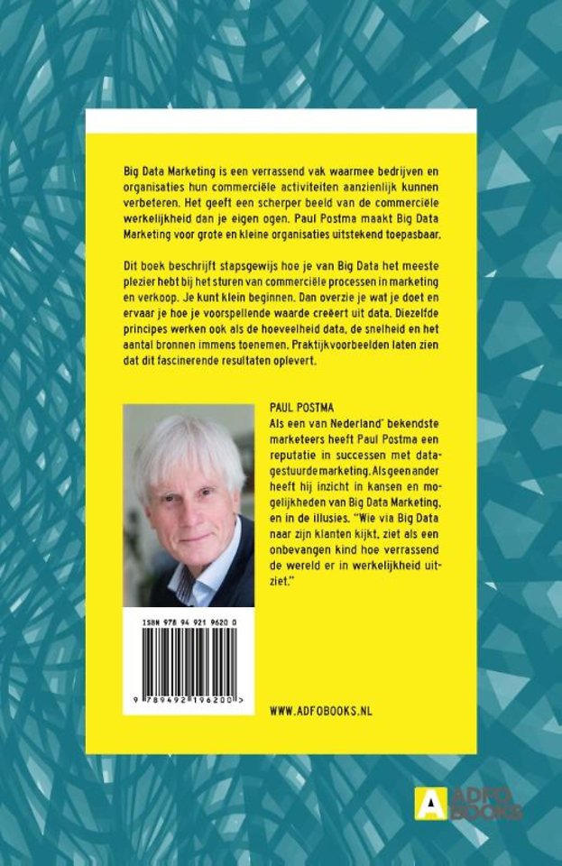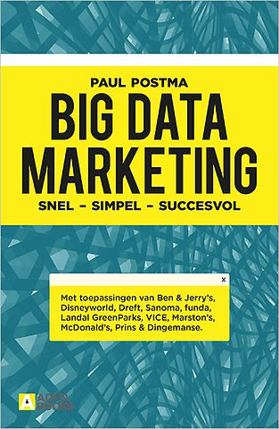 In Big Data Marketing, simpel – snel – succesvol combineert Paul Postma de wereldwijde impact van Big Data Marketing met de praktische alledaagse toepassingen voor organisaties. Big Data Marketing is een verrassend vak waarmee bedrijven en organisaties hun commerciële activiteiten aanzienlijk kunnen verbeteren. Het laat een scherper beeld zien van de commerciële werkelijkheid dan je eigen ogen. Paul Postma maakt Big Data Marketing voor grote en kleine organisaties uitstekend toepasbaar. En laat zien hoe je de voordelen kunt realiseren.