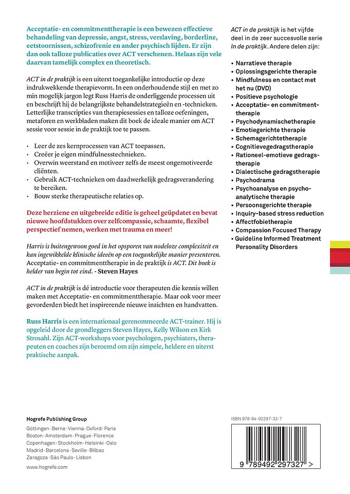 'Harris is buitengewoon goed in het opsporen van nodeloze complexiteit en kan ingewikkelde klinische ideeën op een toegankelijke manier presenteren. Acceptatie- en commitmenttherapie in de praktijk ís ACT. Dit boek is helder van begin tot eind.' - Steven Hayes