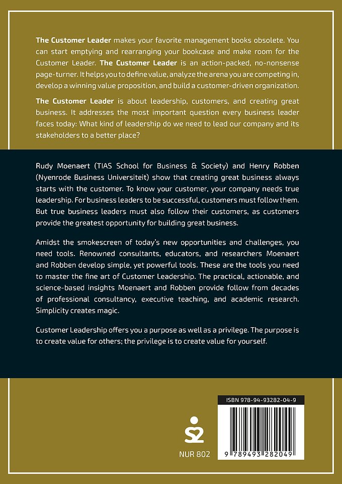 The Customer Leader makes your favorite management books obsolete. You can start emptying and rearranging your bookcase and make room for the Customer Leader. The Customer Leader is an action-packed, no-nonsense page-turner. It helps you to define value, analyze the arena you are competing in, develop a winning value proposition, and build a customer-driven organization.
