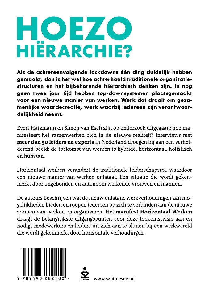 Evert Hatzmann en Simon van Esch zijn op onderzoek uitgegaan: hoe manifesteert het samenwerken zich in de nieuwe realiteit? Interviews met meer dan 50 leiders en experts in Nederland droegen bij aan een verhelderend beeld: de toekomst van werken is hybride, horizontaal, holistisch en humaan. Horizontaal werken verandert de traditionele leiderschapsrol, waardoor een nieuwe manier van werken ontstaat. Een situatie die wordt gekenmerkt door ongebonden en autonoom werkende vrouwen en mannen.
